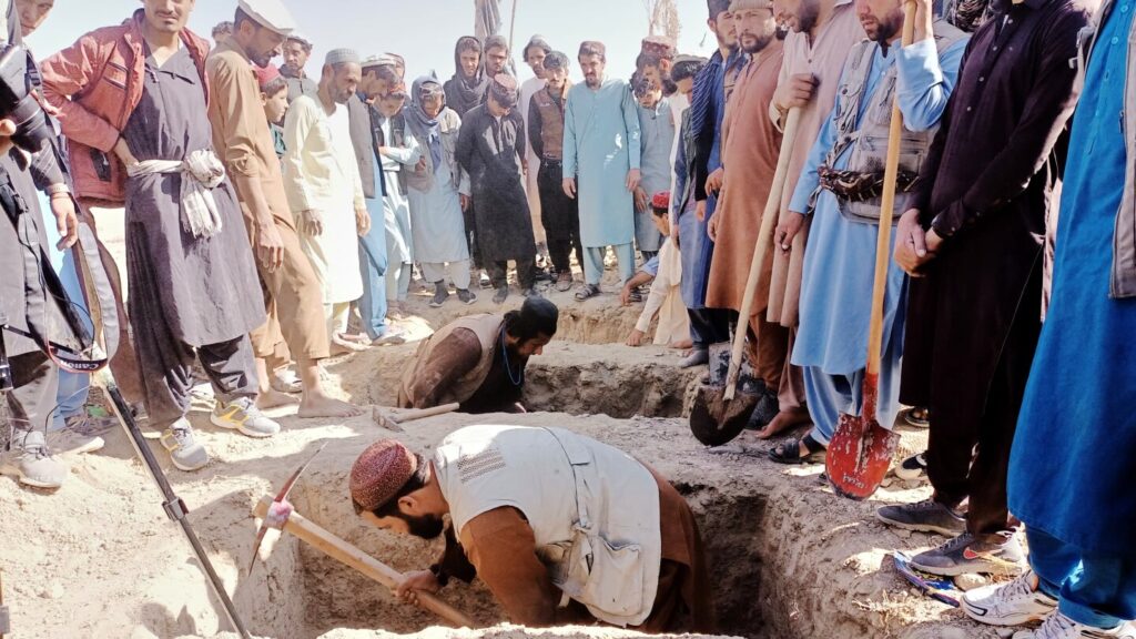 On Saturday, several thousand people attended funeral prayers in Paktika. They sat in the open air as loudspeakers broadcast sermons and condemnation.