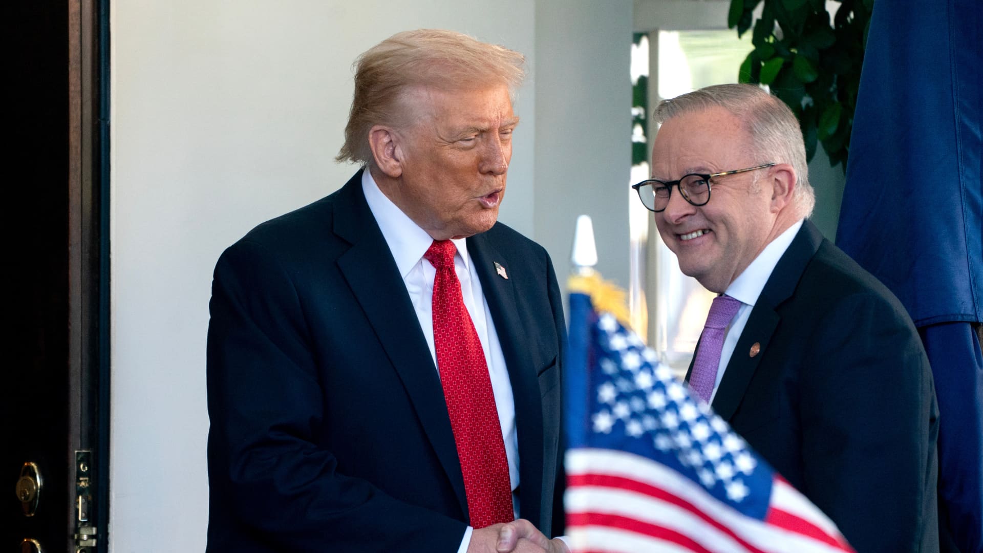 U.S. President Donald Trump, and Anthony Albanese, Australia’s prime minister, shake hands outside the West Wing of the White House in Washington, DC, US, on Monday, Oct. 20, 2025.