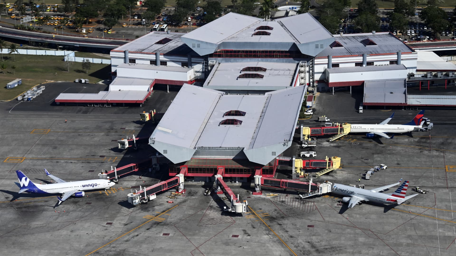 Aerial view of Jose Marti International Airport in Havana, taken from an airplane on April 3, 2025.