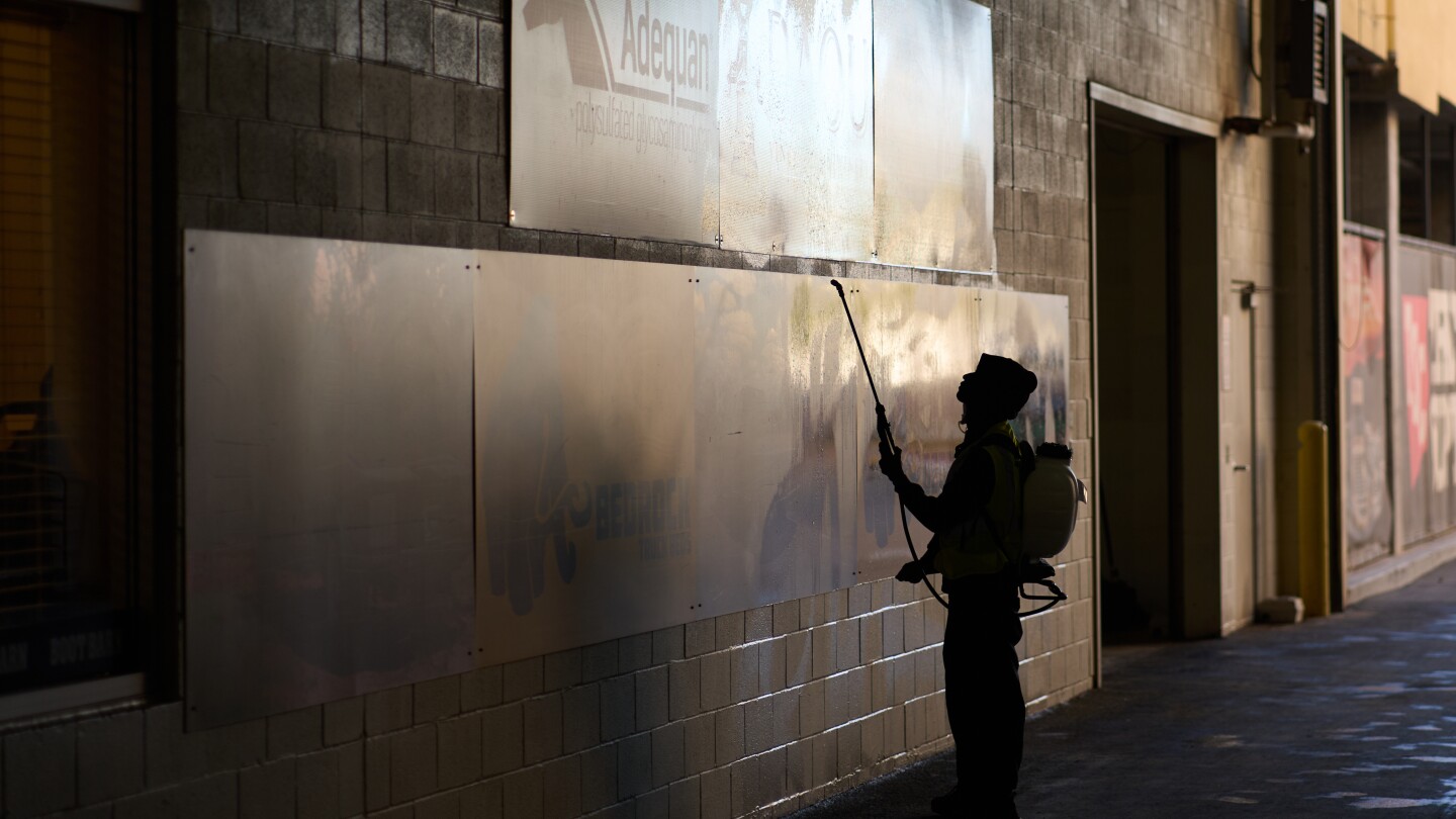 A worker disinfects walls at the South Point hotel-casino in Las Vegas Tuesday, Dec. 9, 2025, in Las Vegas. (AP Photo/John Locher)