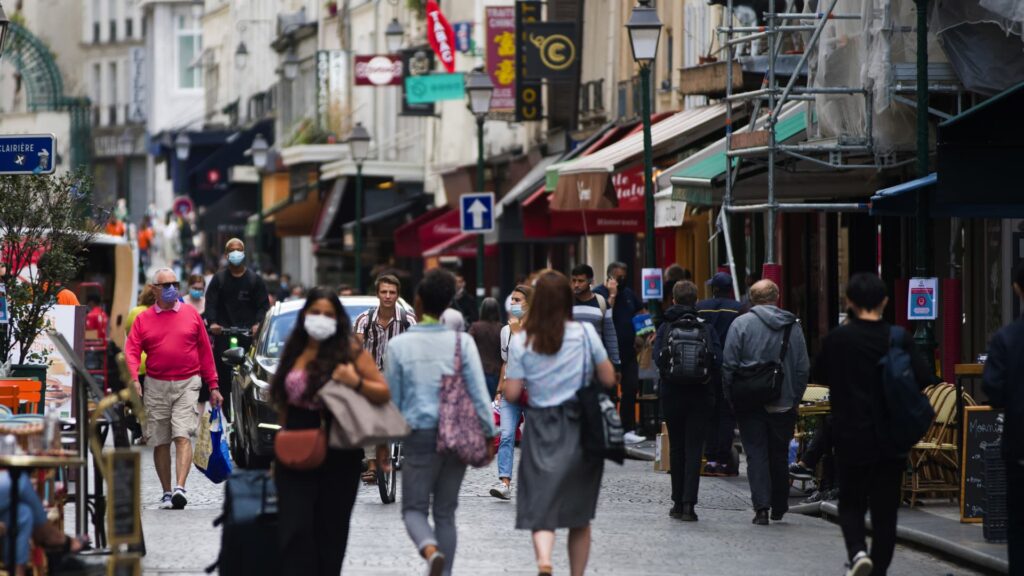 Pedestrians wear protective face masks while passing stores and cafes on Rue Montorgueil in Paris, France, on Wednesday, Aug. 26, 2020.