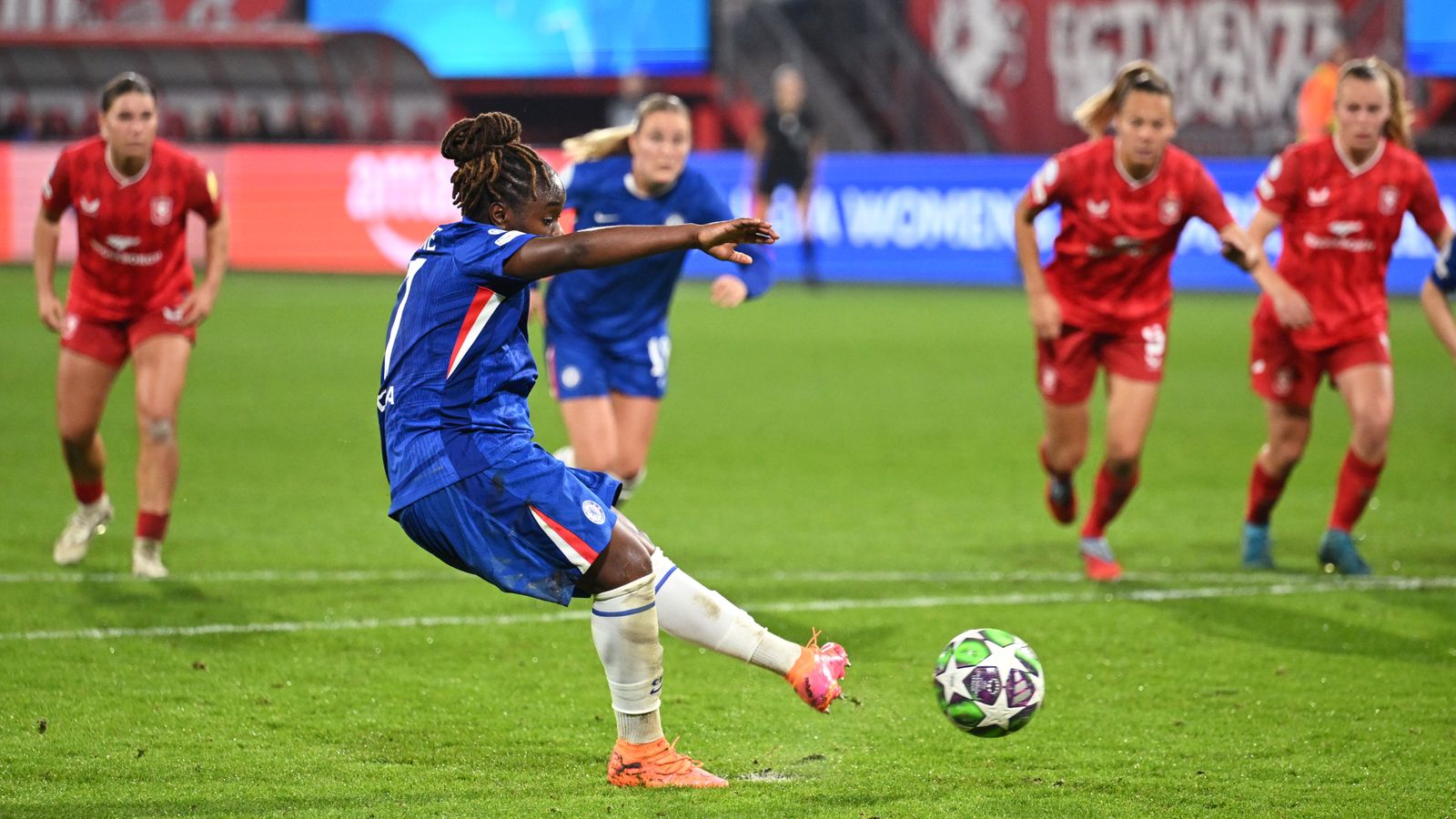 Chelsea ought to have fallen behind after 11 minutes to a rare Twente opening, Leonie Vliek playing a clever one-two with Jill Roord to make space to shoot but inexplicably opting to pass, allowing Ellie Carpenter to recover and make the clearance.