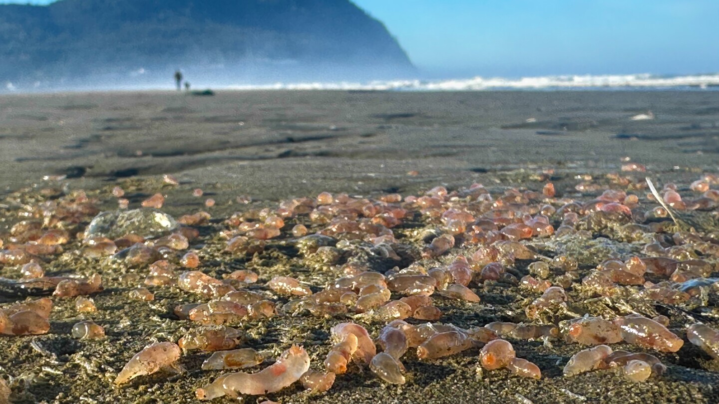 Thousands of sea cucumbers have washed up on the beach in the Oregon coastal town of Seaside thanks to a combination of heavy surf and low tide.