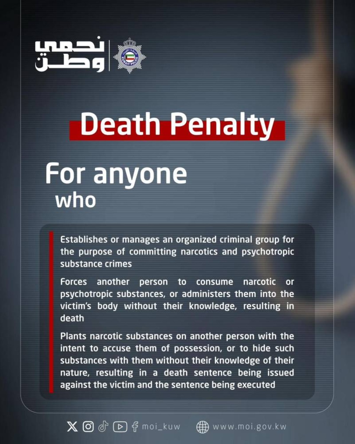 KUWAIT: The interior ministry and the public prosecution on Monday launched a national awareness campaign over the new tough anti-drug legislation which is due to be implemented on Dec 15. The two bodies issued statements explaining articles of the law and focusing on harsh penalties included in the law, in which the application of the death penalty has been expanded.
