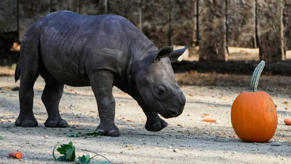 A male Eastern Black Rhino calf born Sept. 13, 2025, approaches a pumpkin Friday, Oct. 10, 2025 as he makes his public debut at the Cleveland Metroparks Zoo in Cleveland, Ohio. (AP Photo/Sue Ogrocki)