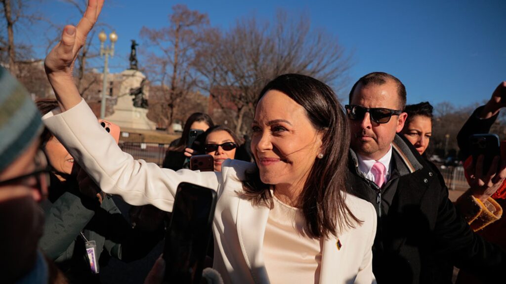 Venezuelan opposition leader and Nobel Peace Prize winner María Corina Machado waves to supporters outside the White House following a meeting with U.S. President Donald Trump on January 15, 2026 in Washington, DC.