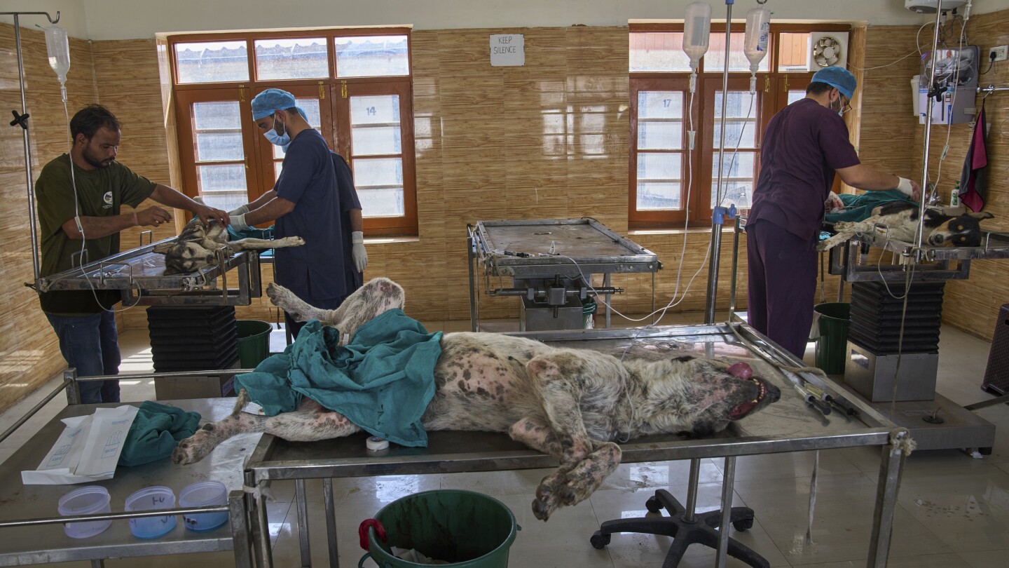 Volunteers from an animal welfare organization prepare a stray dog for sterilization at a veterinary hospital in Srinagar, Indian controlled Kashmir, Tuesday, Sept. 16, 2025. (AP Photo/Dar Yasin)