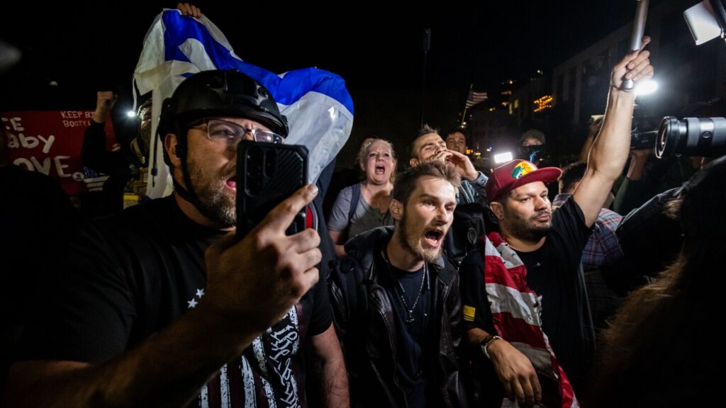 Trump supporters and protesters argue over Israeli and Palestinians outside a U.S. Immigration and Customs Enforcement facility in Portland, Ore., Monday, Oct. 6, 2025. (AP Photo/Ethan Swope)