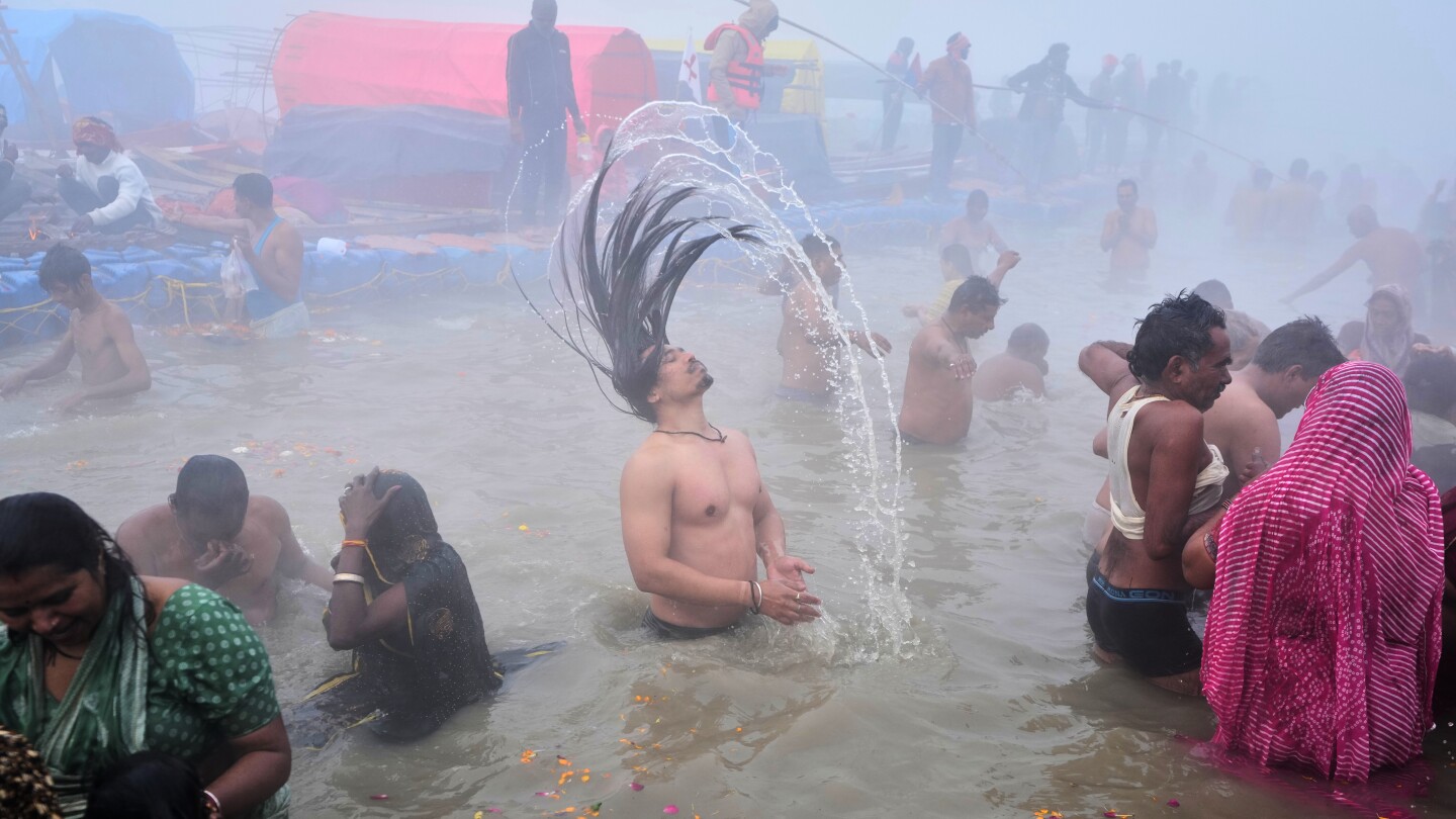 Devotees take a holy dip on Mauni Amavasya, a divine occasion in Hindu religious practice followed for honoring ancestors or forefathers, at the Sangam, the confluence of the Ganges, the Yamuna and the mythical Saraswati rivers, during the annual month long Hindu religious fair “Magh Mela” in Prayagraj, India, Sunday, Jan. 18, 2026. (AP Photo/Rajesh Kumar Singh)