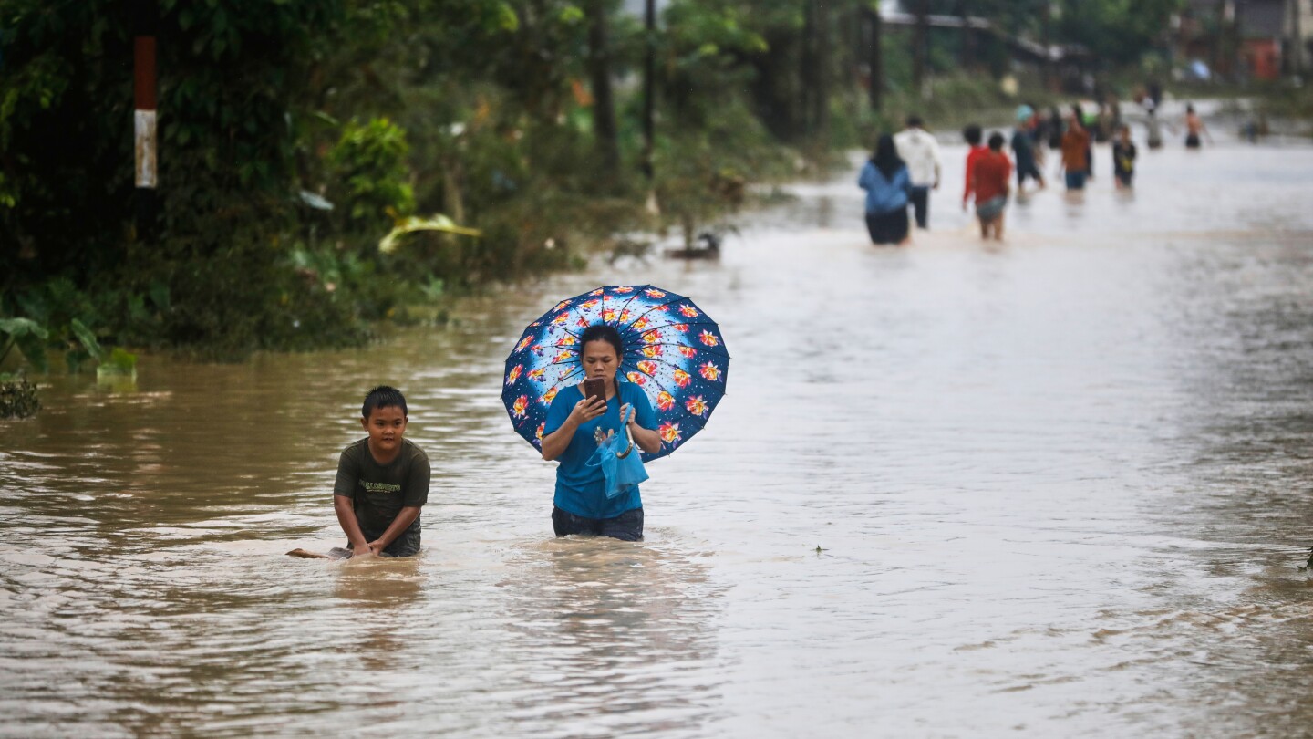 People wade through the water at a flooded street in Medan, North Sumatra, Indonesia, Thursday, Nov. 27, 2025. (AP Photo/Binsar Bakkara)
