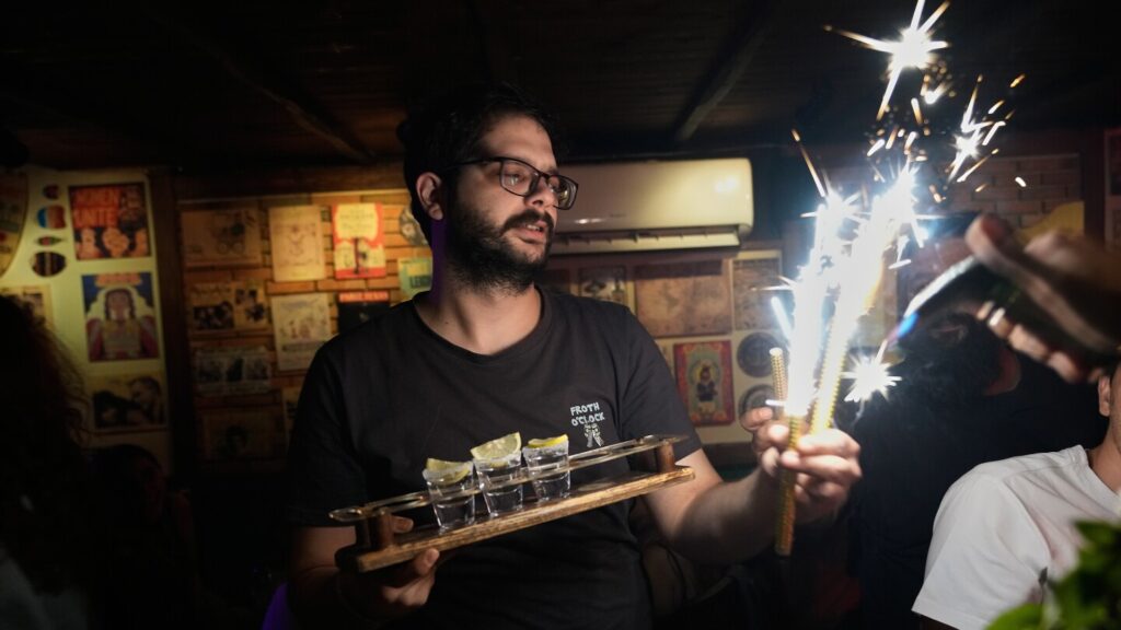 A bartender prepares a drink at a bar, as people enjoy the first night of the weekend, in Damascus, Syria, early Friday, Oct. 3, 2025. (AP Photo/Hussein Malla)
