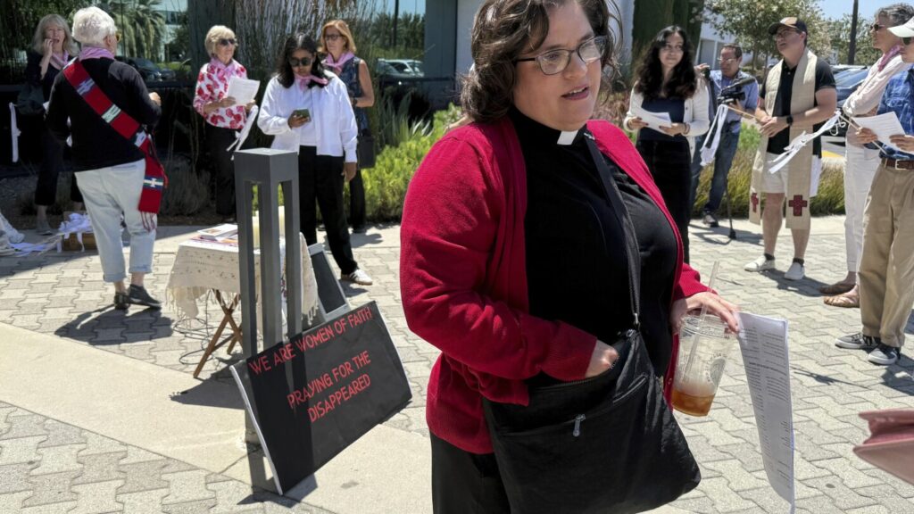 SANTA ANA, Calif. (AP) — Outside a Southern California immigration court, the Rev. Oona Casanova Vazquez sat beside a nervous Peruvian national as he waited for a judge to call his name — talking, smiling, even handing him a mint.