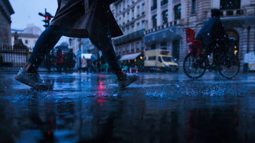 A pedestrian crosses a flooded street following heavy rainfall in Paris on October 17, 2024.