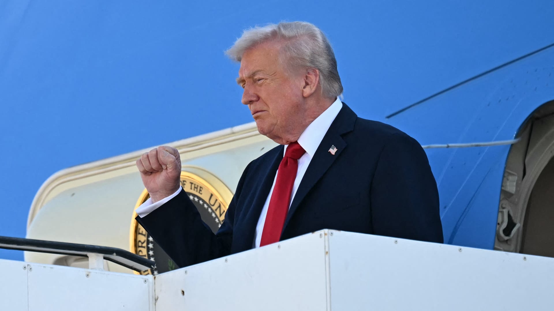 U.S. President Donald Trump gestures as he disembarks from Air Force One upon arrival at Ben Gurion Airport on the outskirts of Lod near Tel Aviv on October 13, 2025, as he travels to Israel and Egypt.
