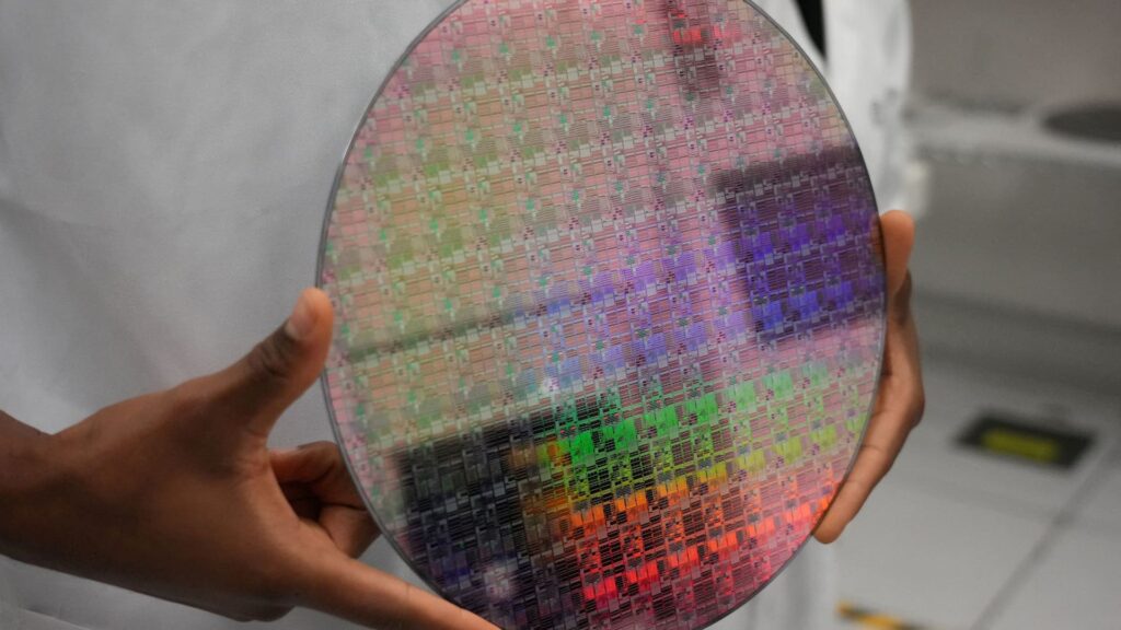 A silicon wafer with chips etched into is seen as U.S. Vice President Kamala Harris tours a site where Applied Materials plans to build a research facility, in Sunnyvale, California, U.S., May 22, 2023.