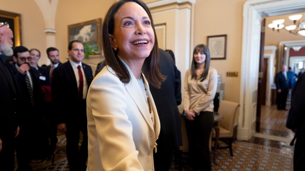 Venezuelan opposition leader María Corina Machado arrives at the Capitol, Thursday, Jan. 15, 2026, in Washington. (AP Photo/Allison Robbert)